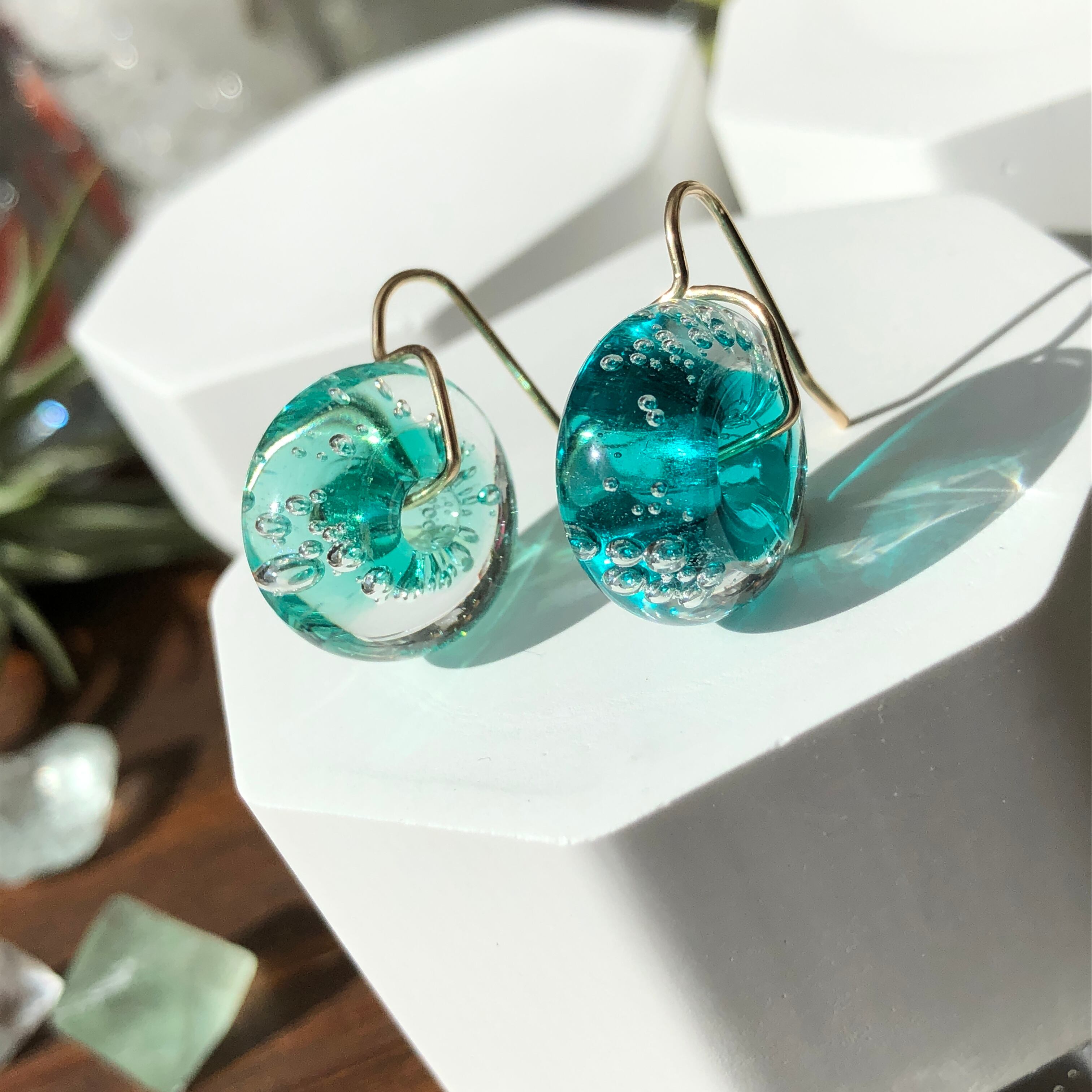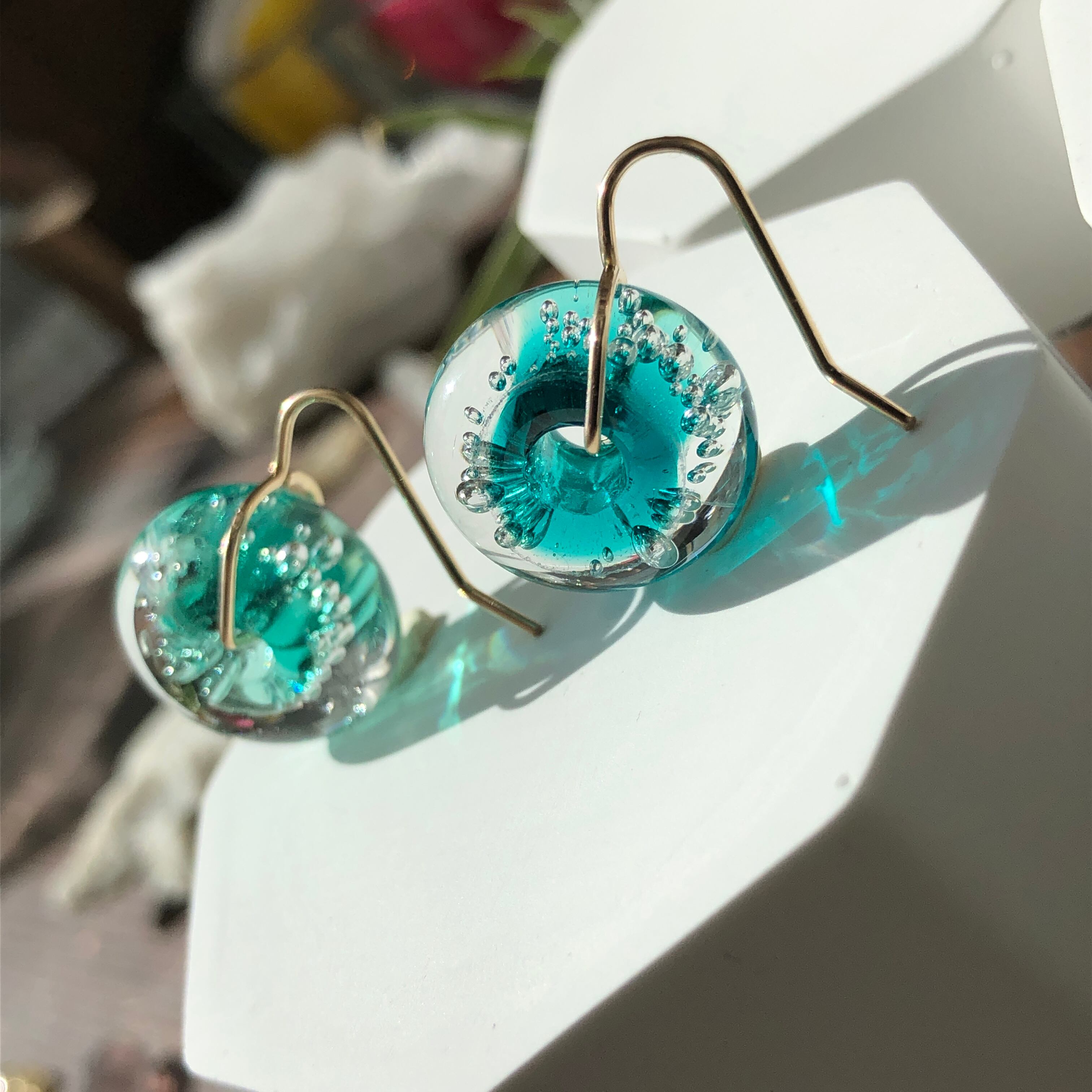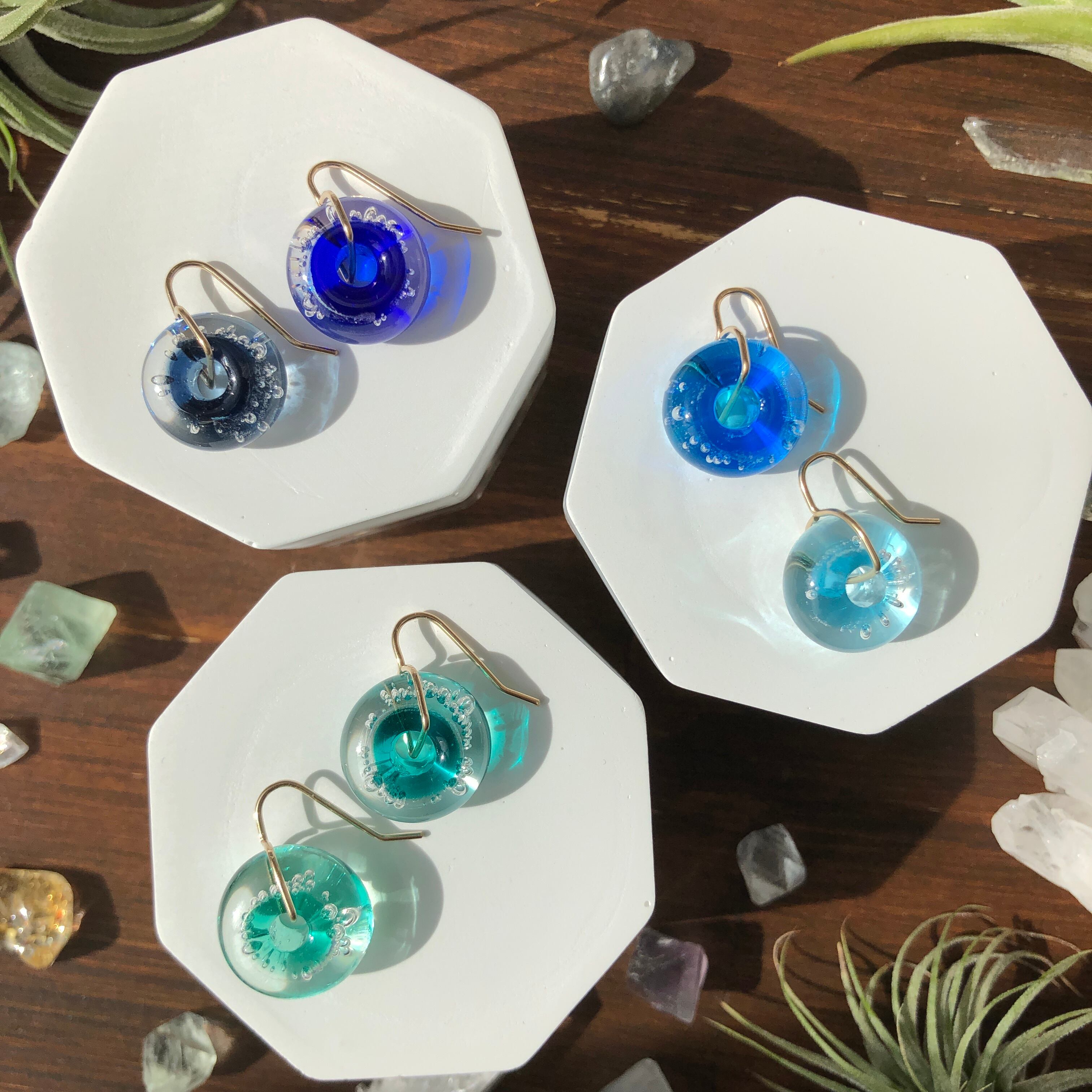 キラキラしたダイクロガラスを使用した泡玉のピアス。