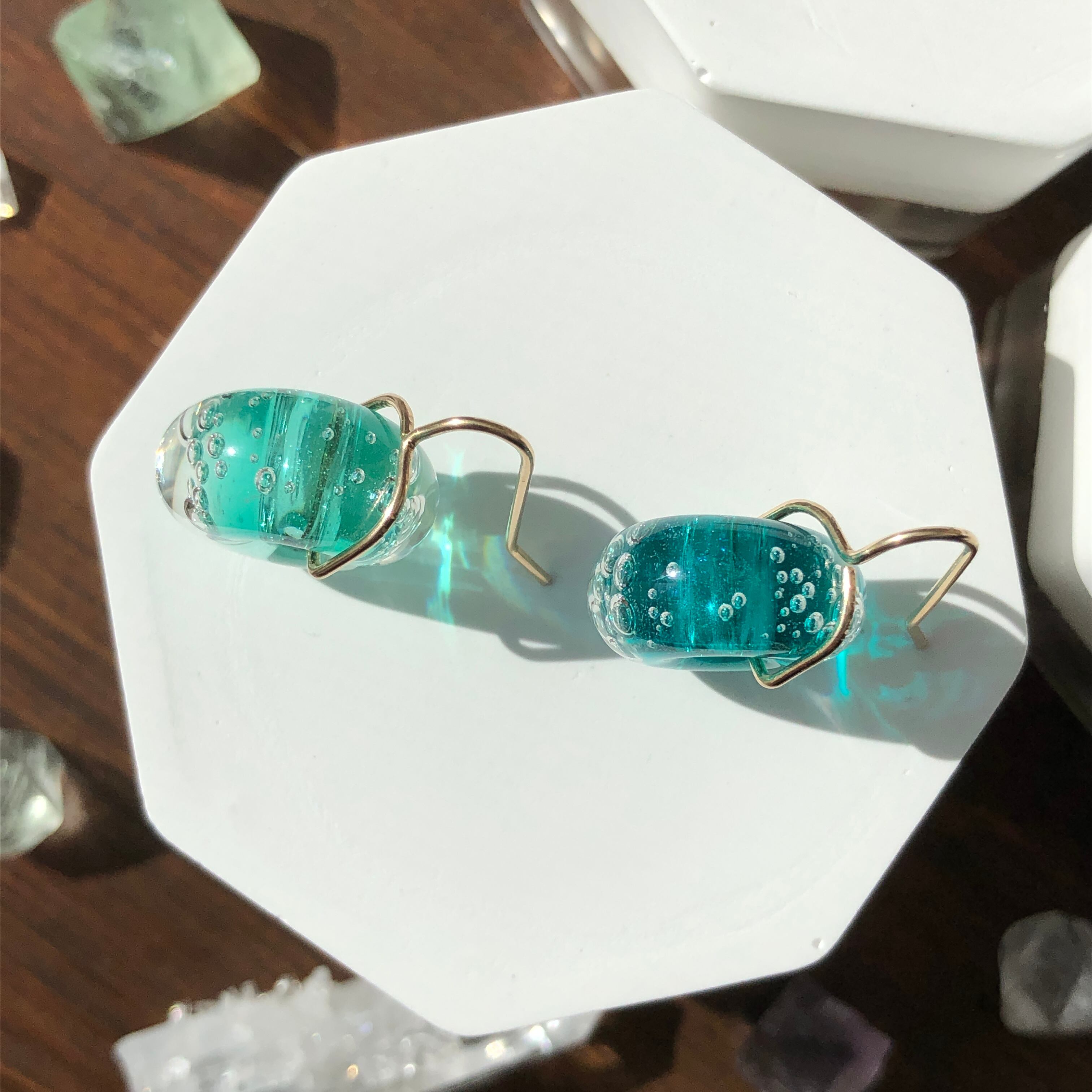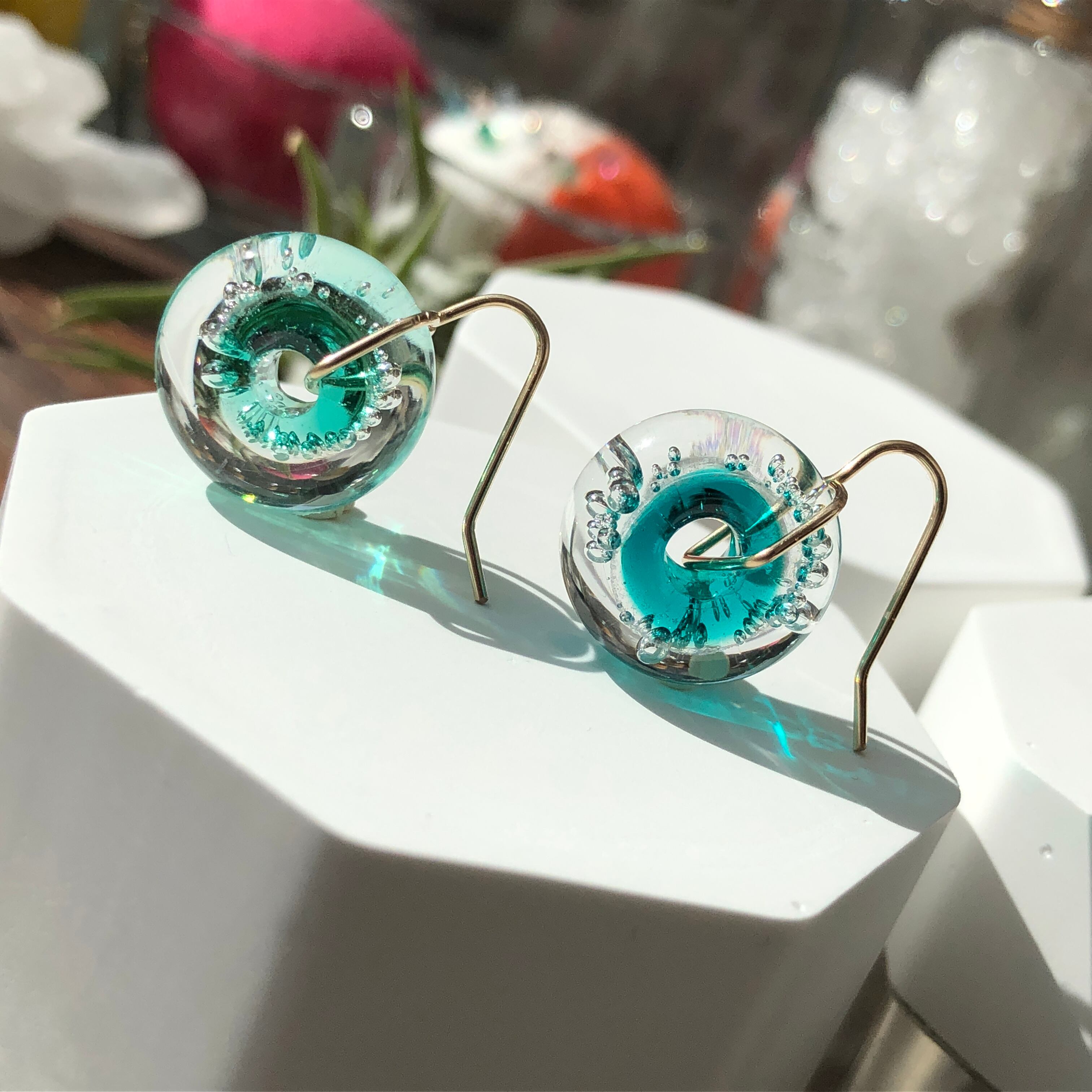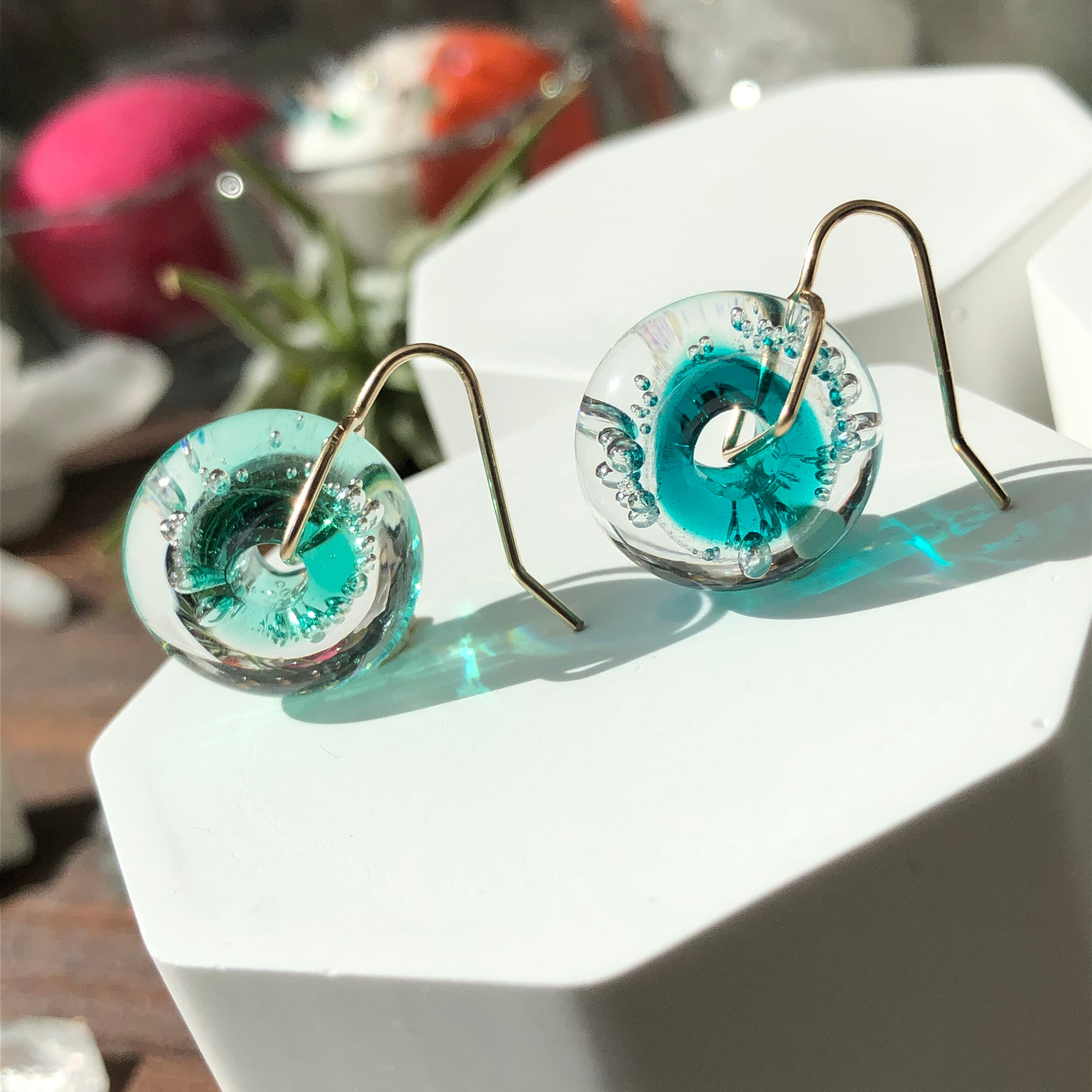 キラキラしたダイクロガラスを使用した泡玉のピアス。
