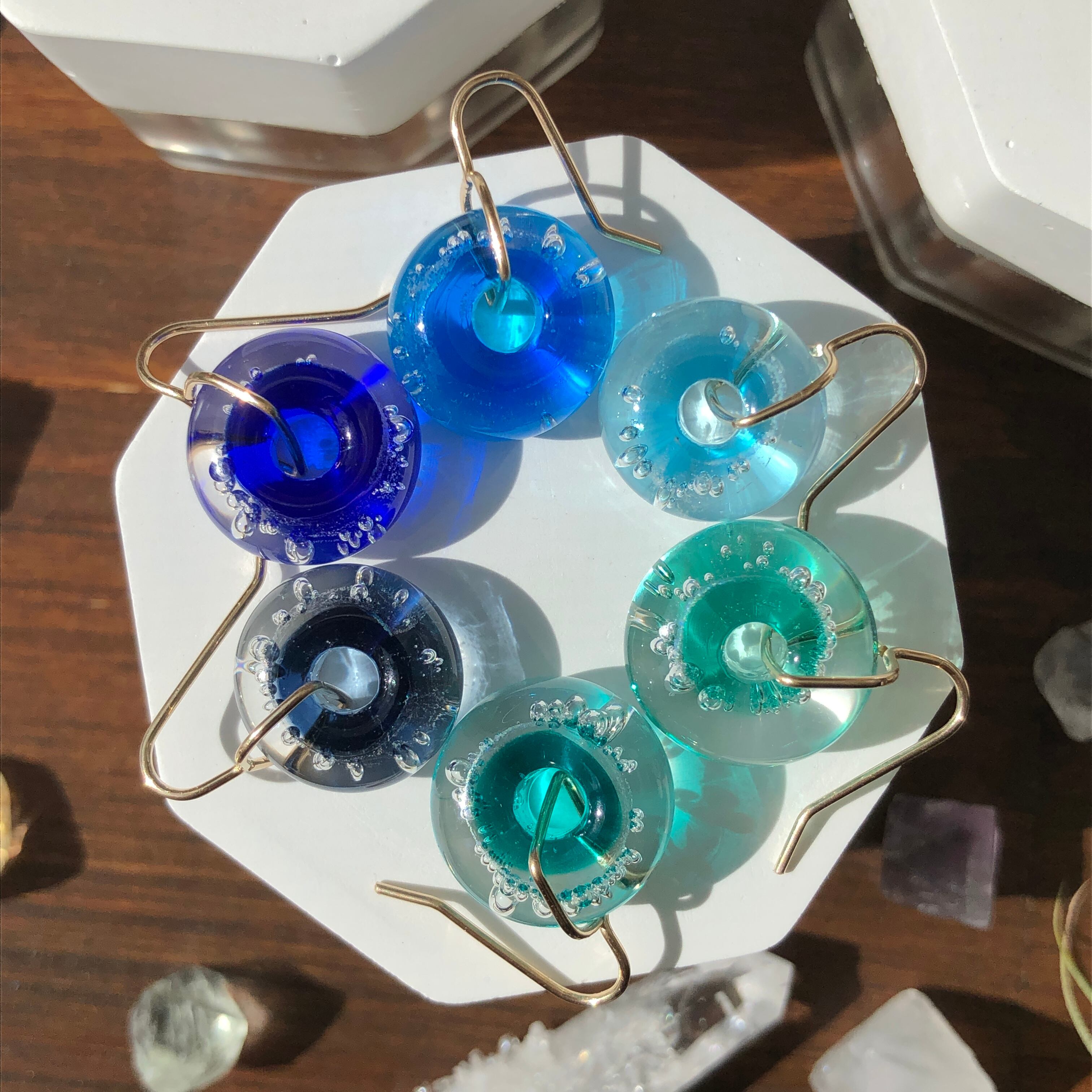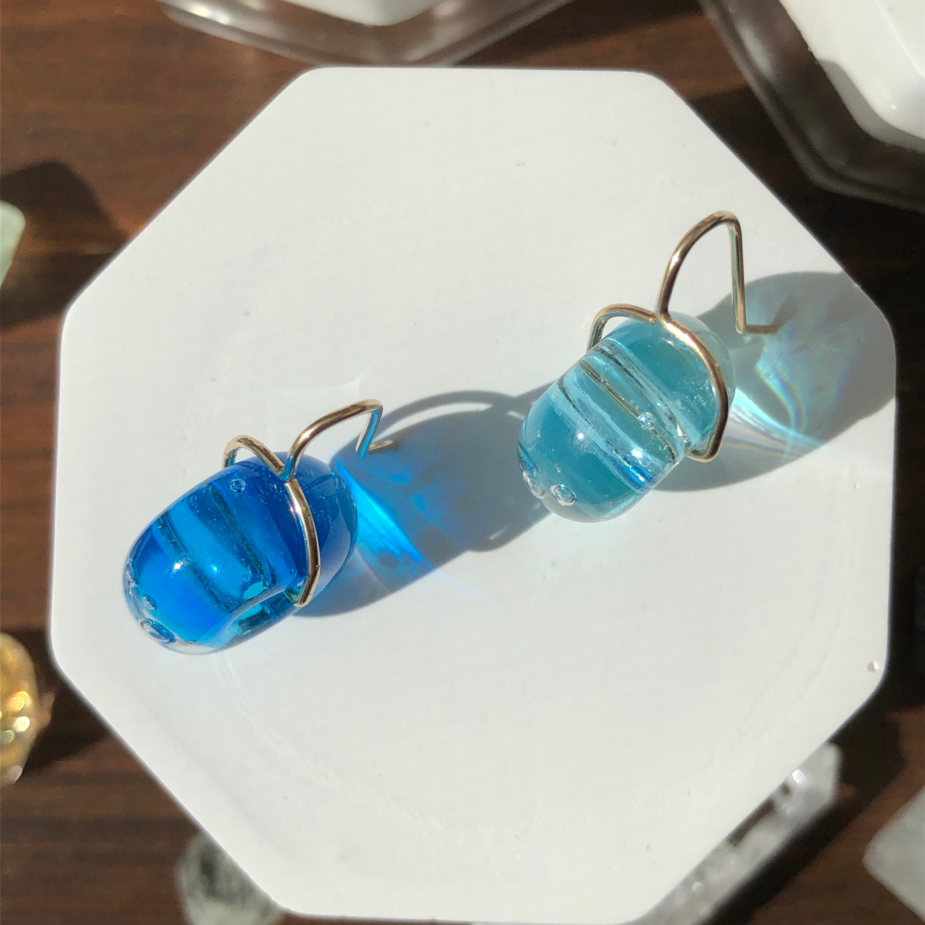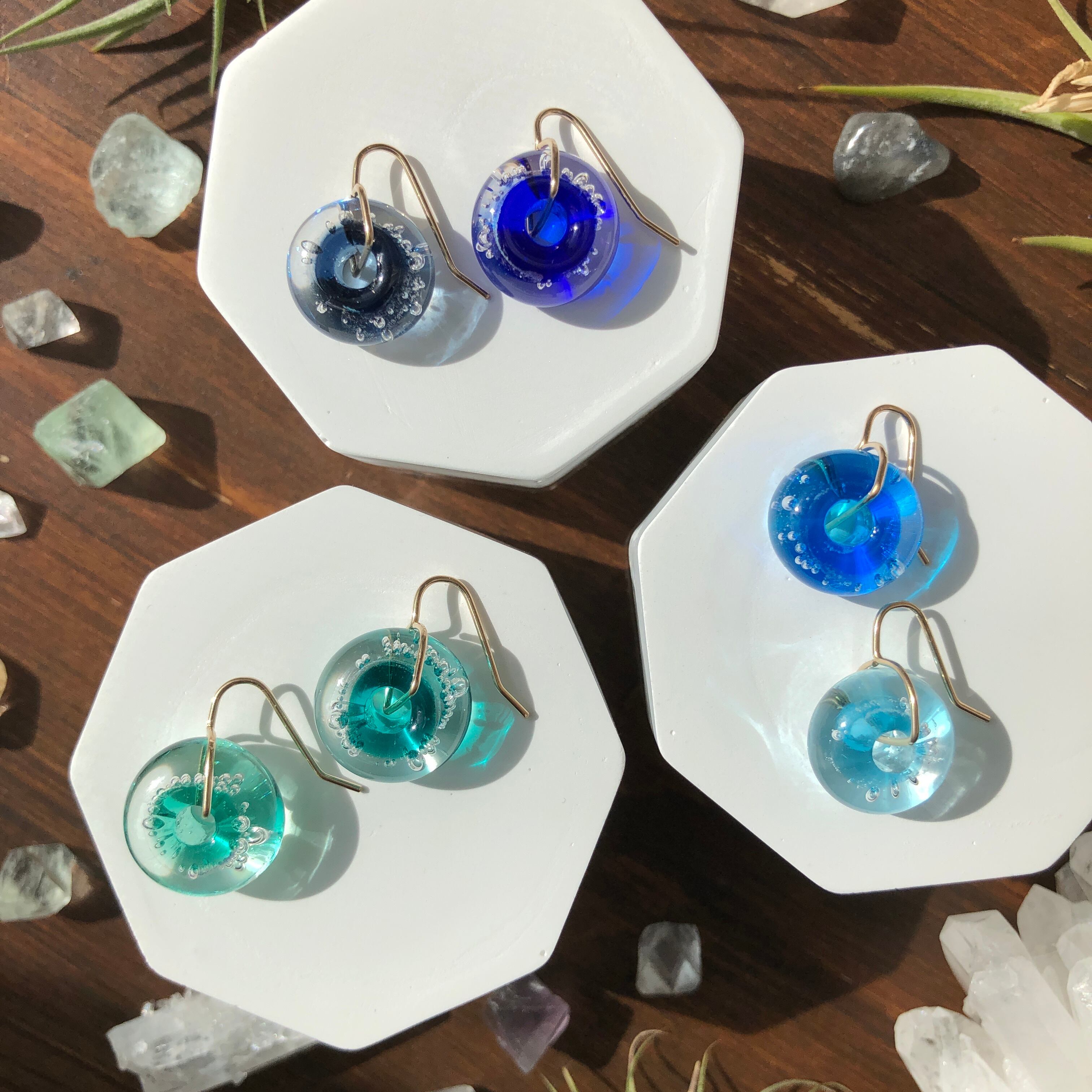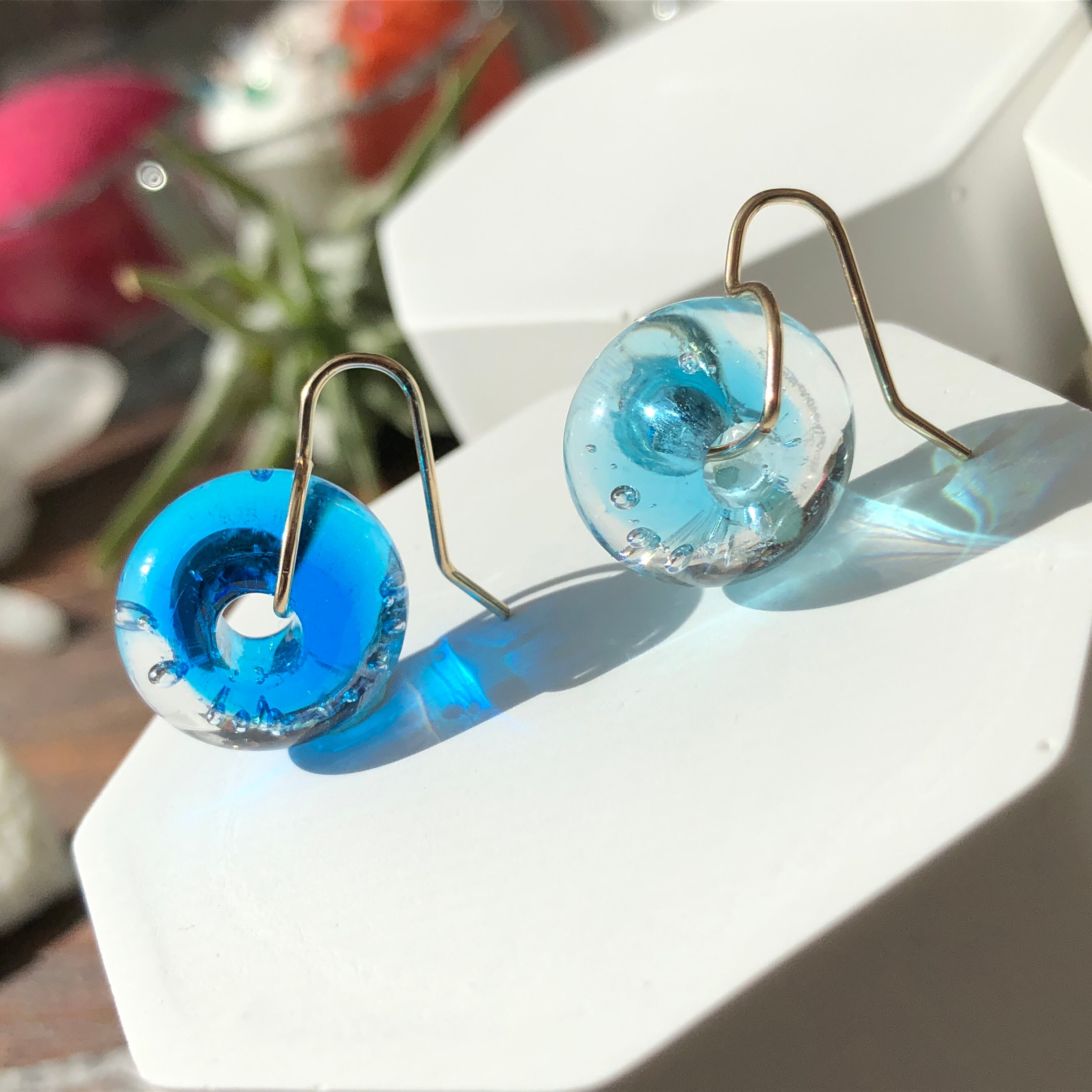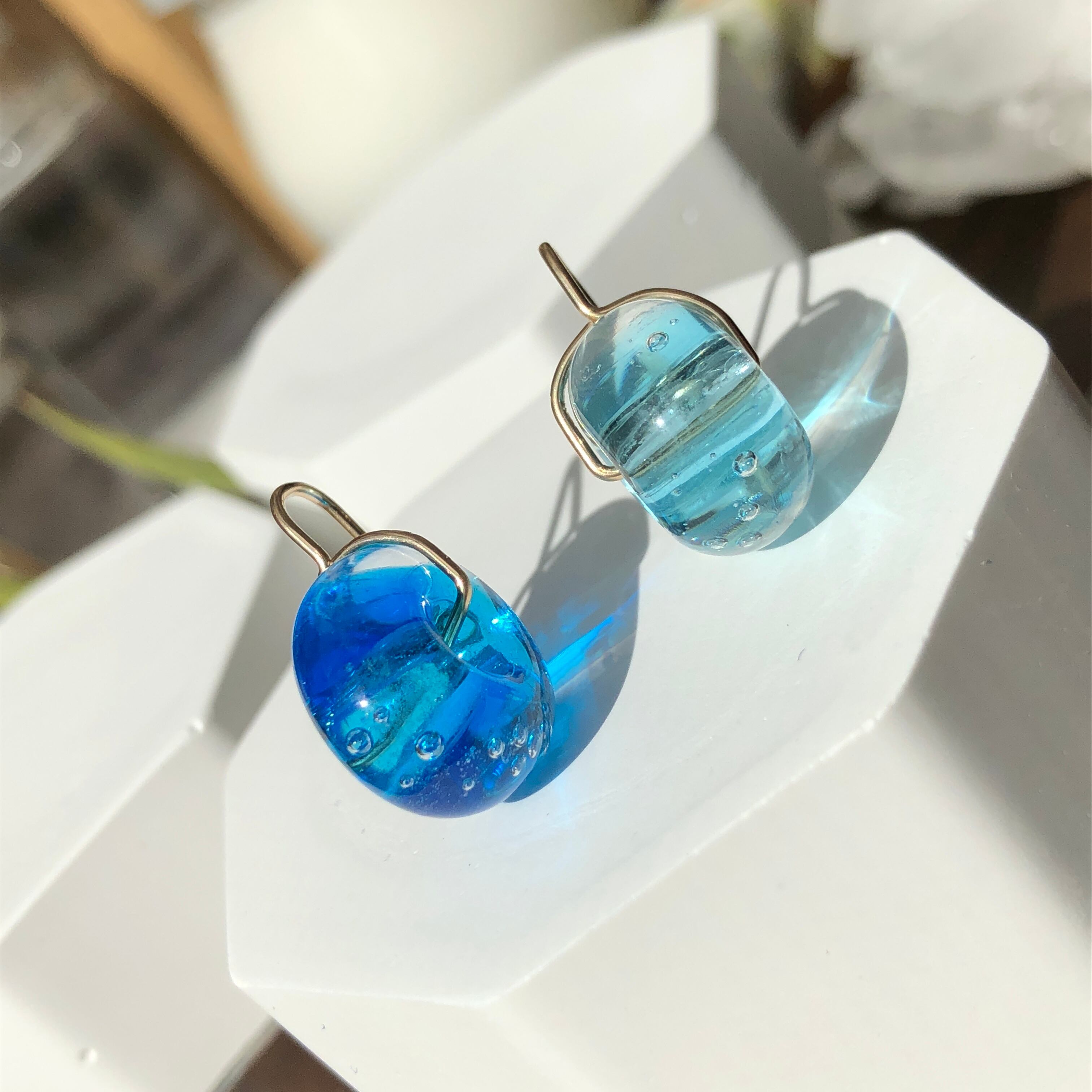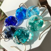 キラキラしたダイクロガラスを使用した泡玉のピアス。