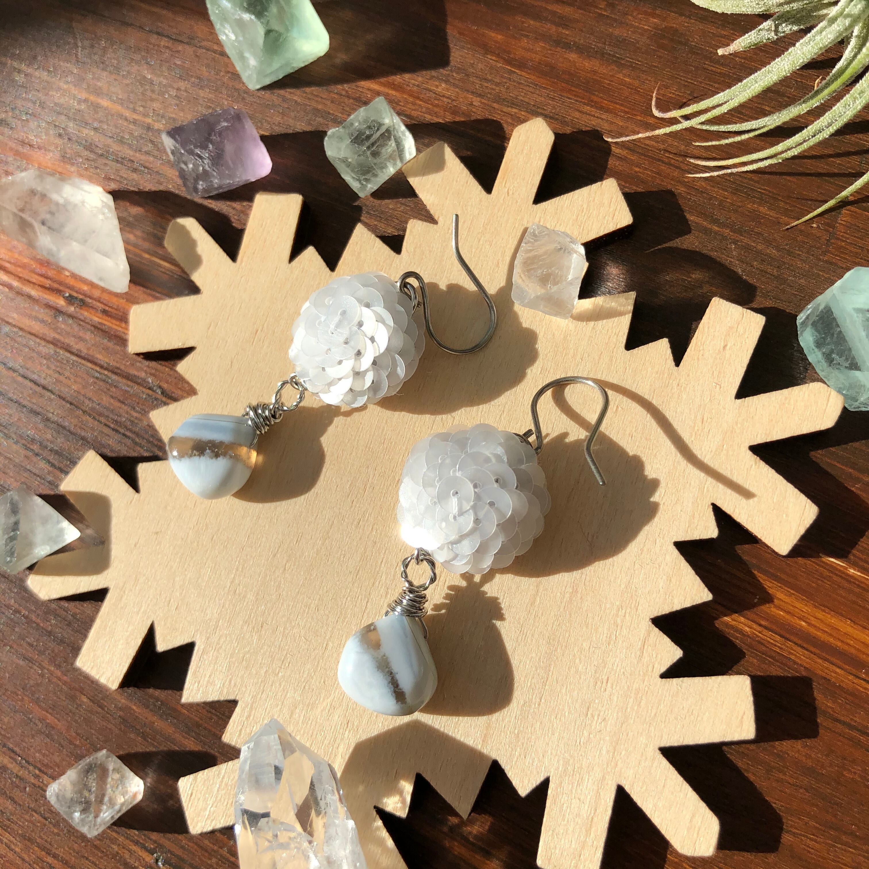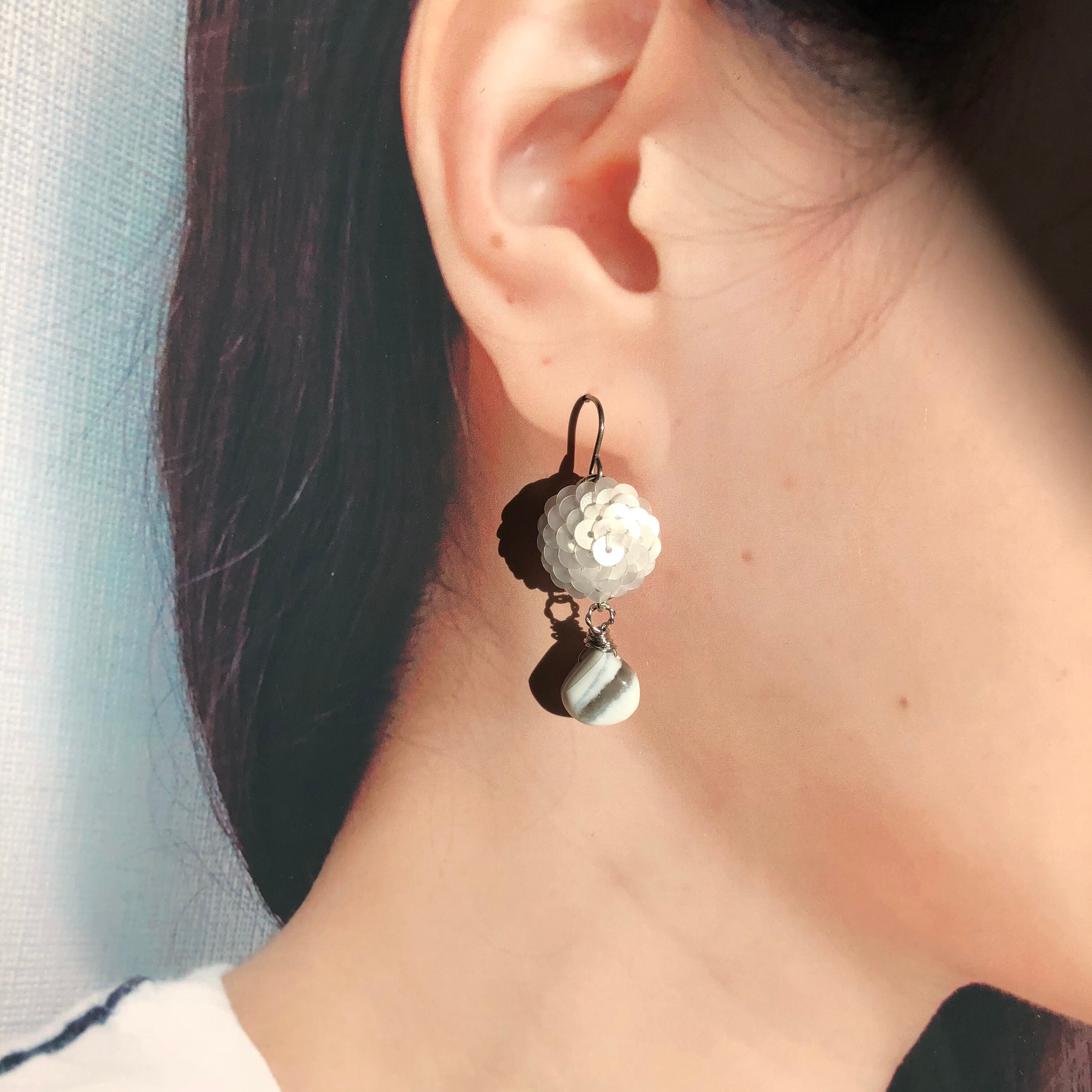 薄めのシルバー色のスパンコールに天然石をプラスしたピアス。