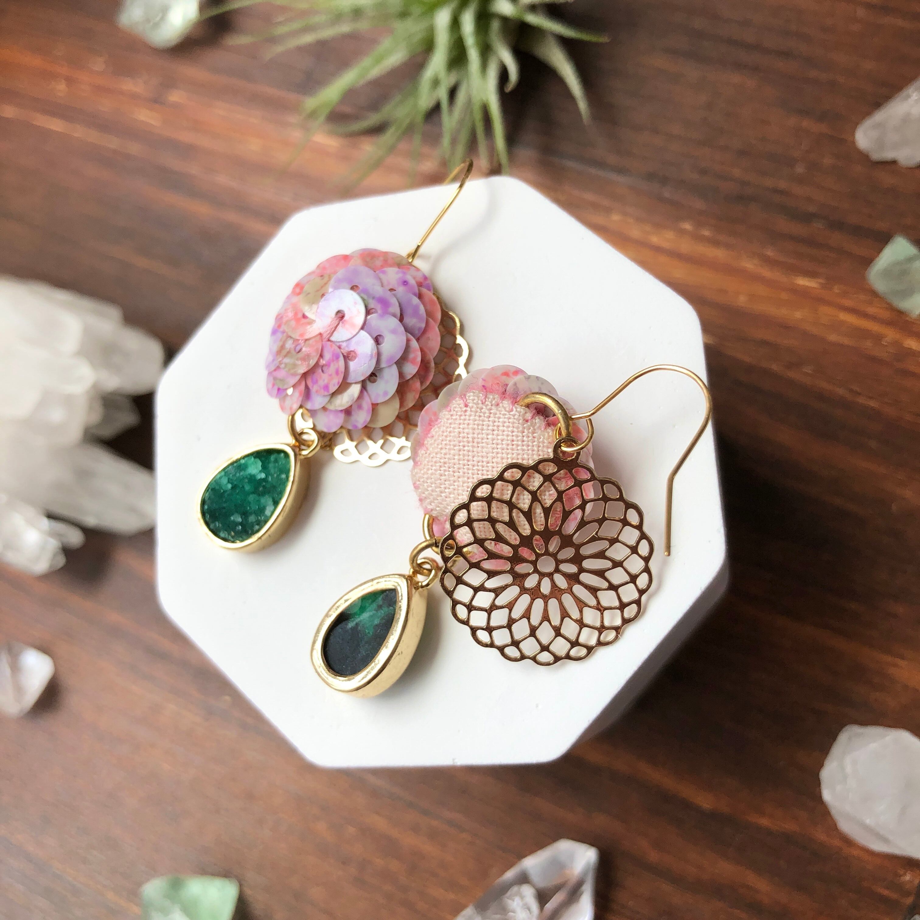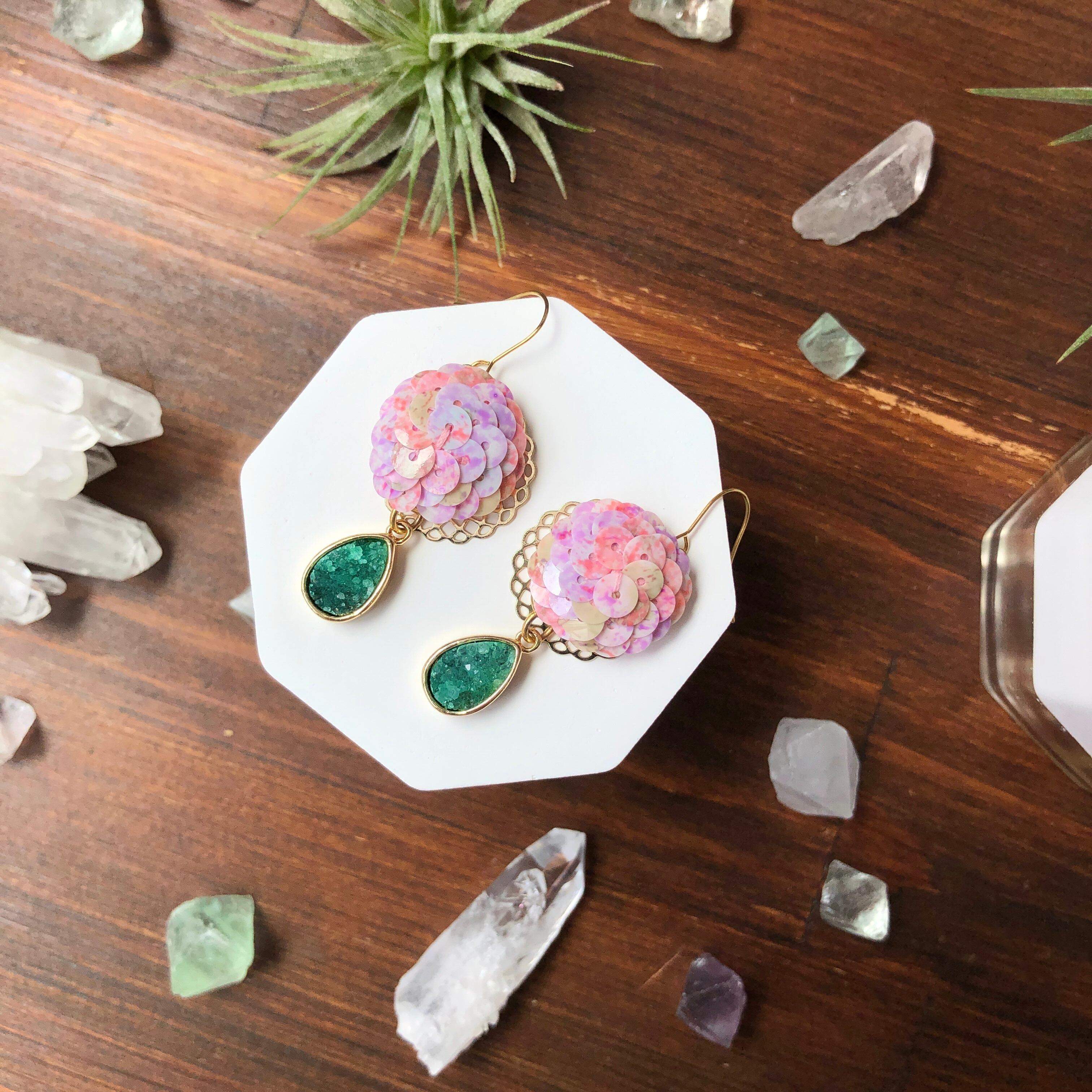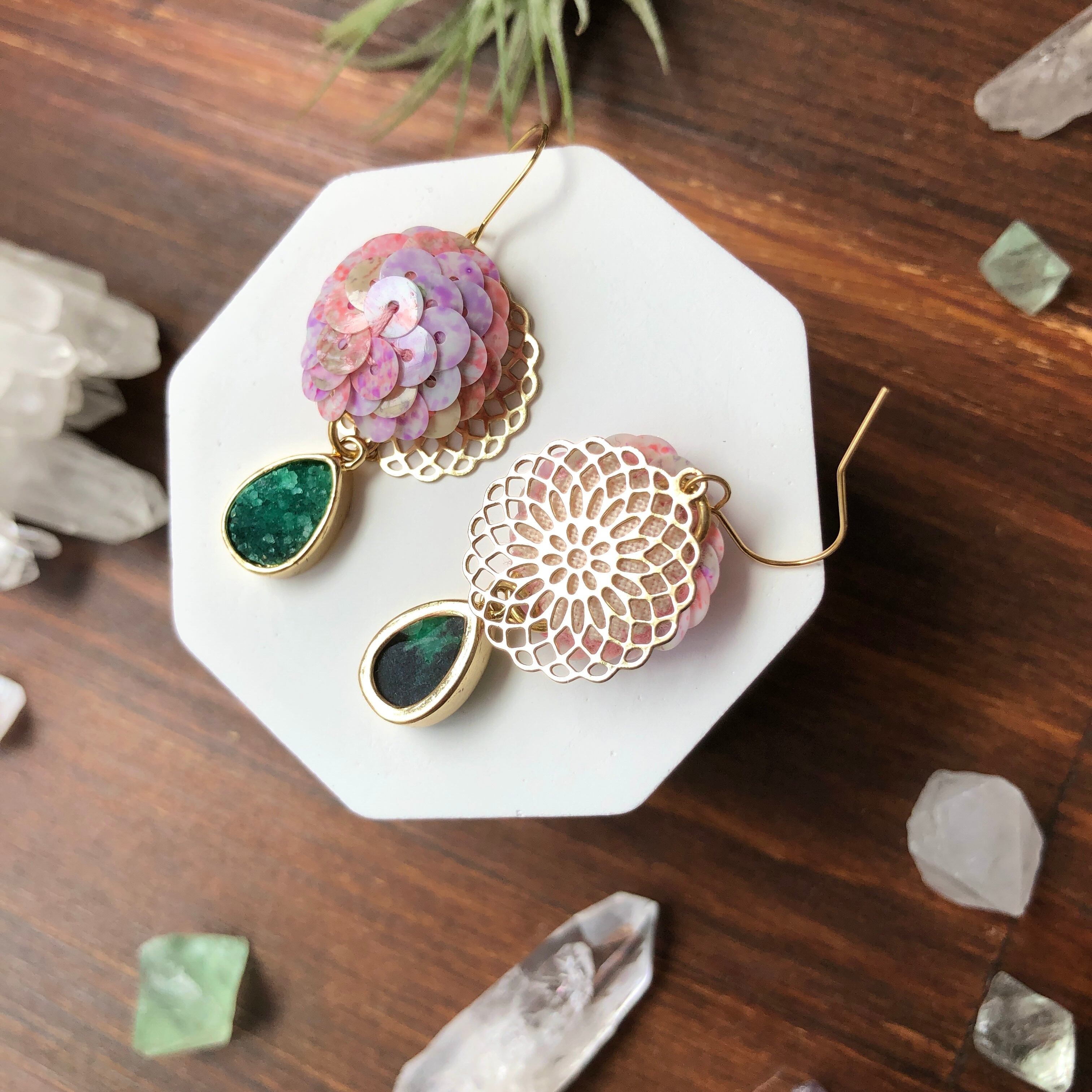柄入りのスパンコールをシンプルに刺繍したピアス。