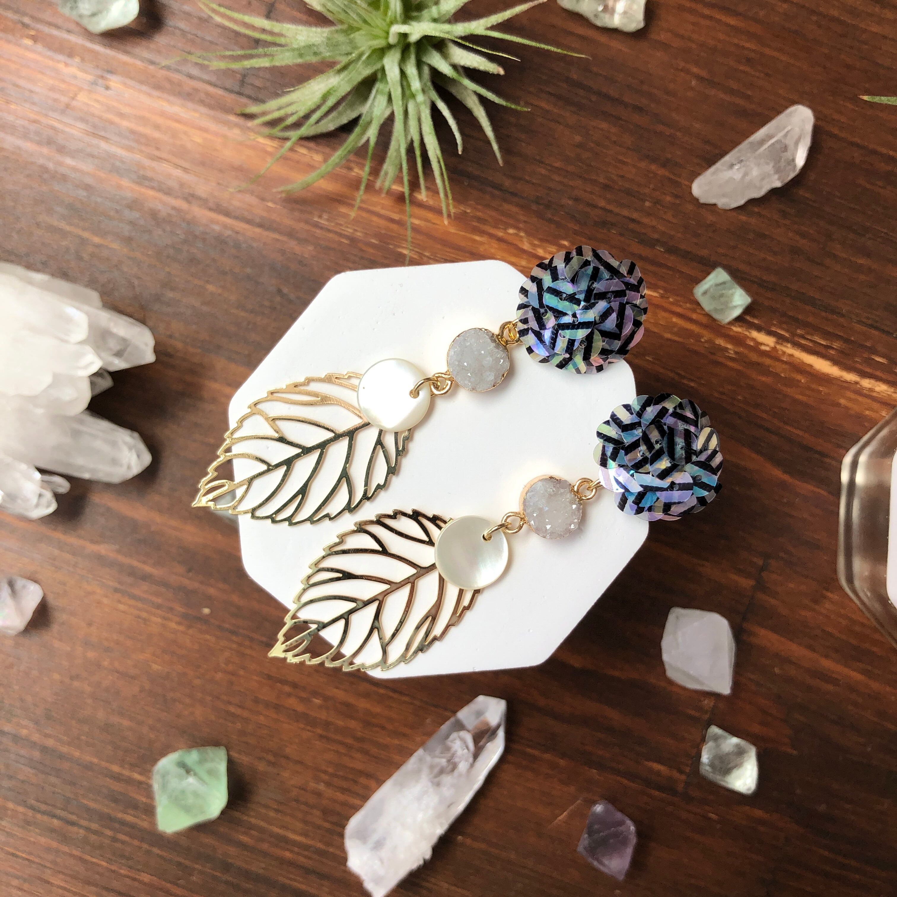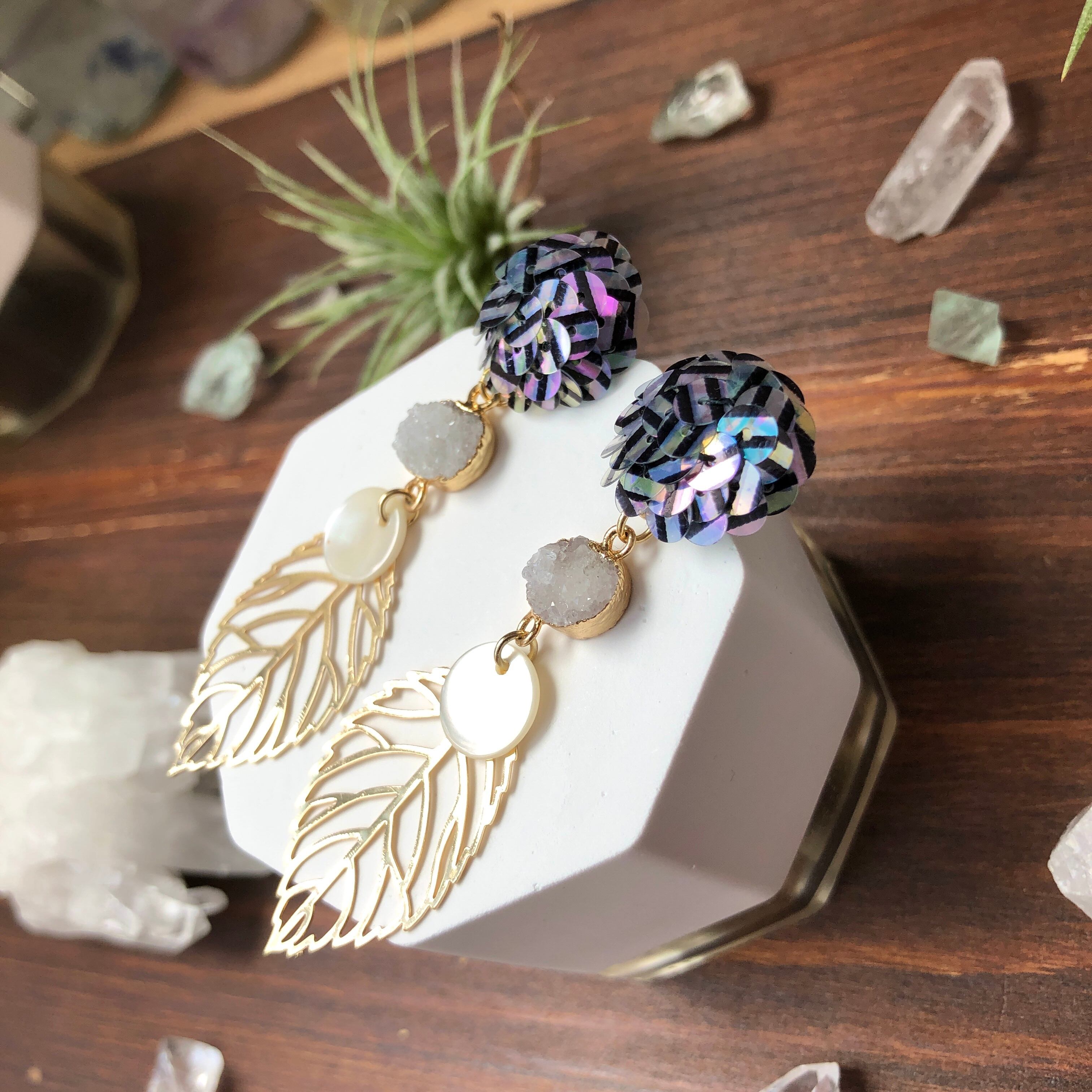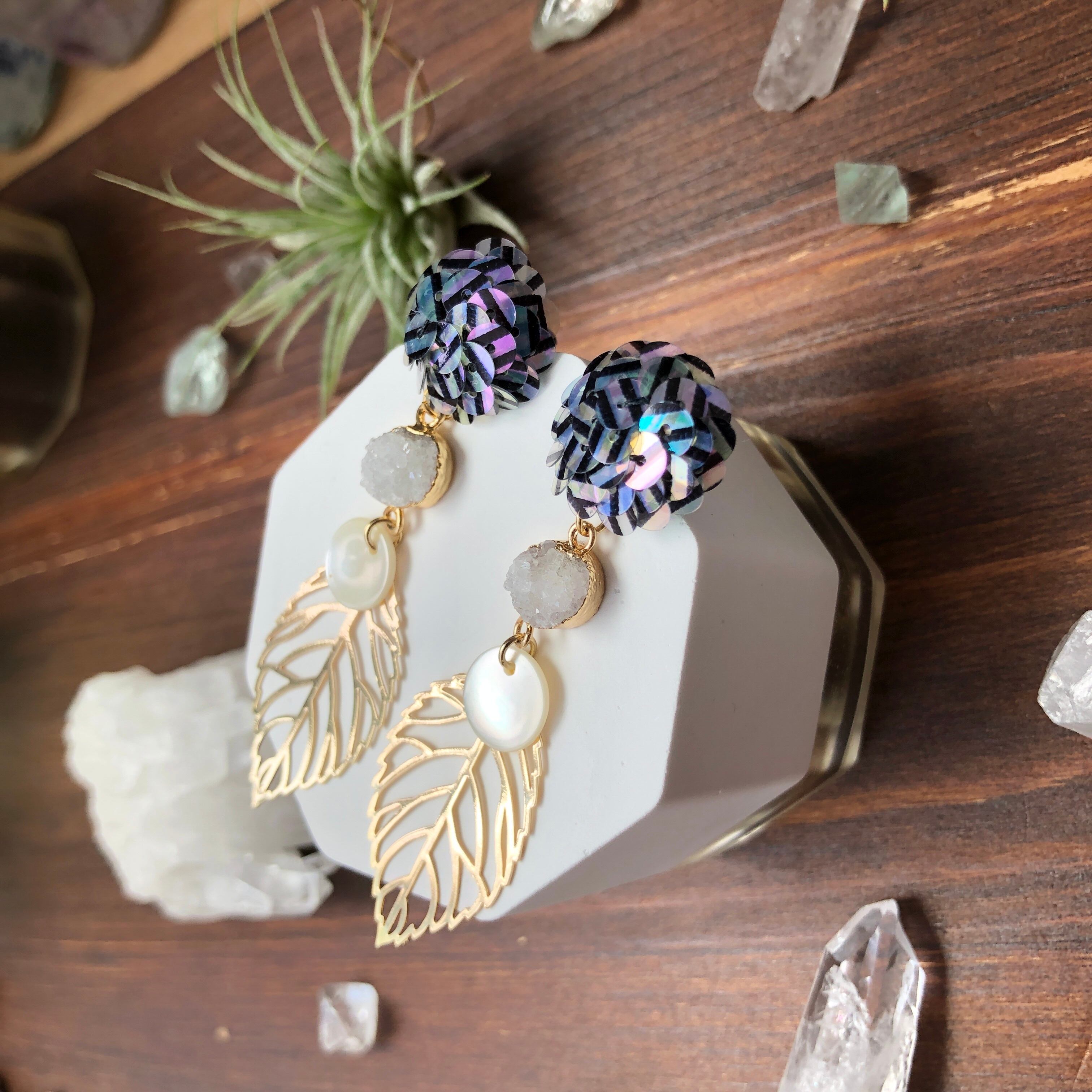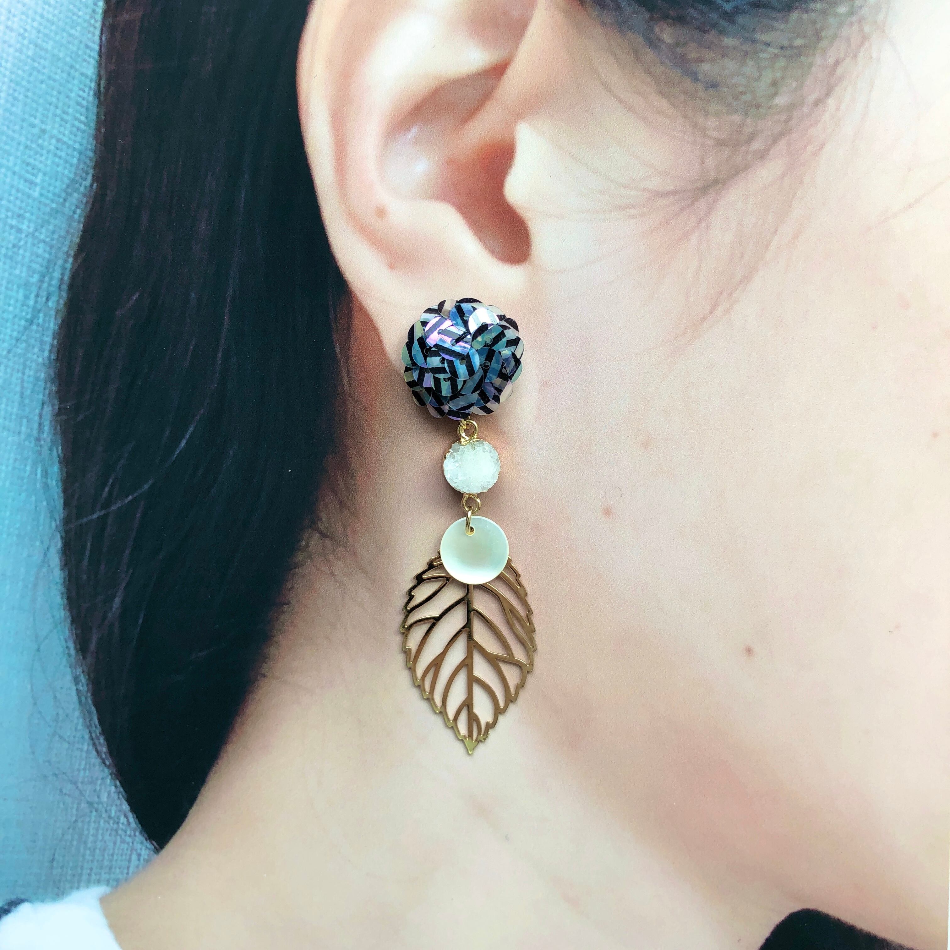 虹彩加工された、ストライプ柄入りのスパンコールを刺繍したピアス。