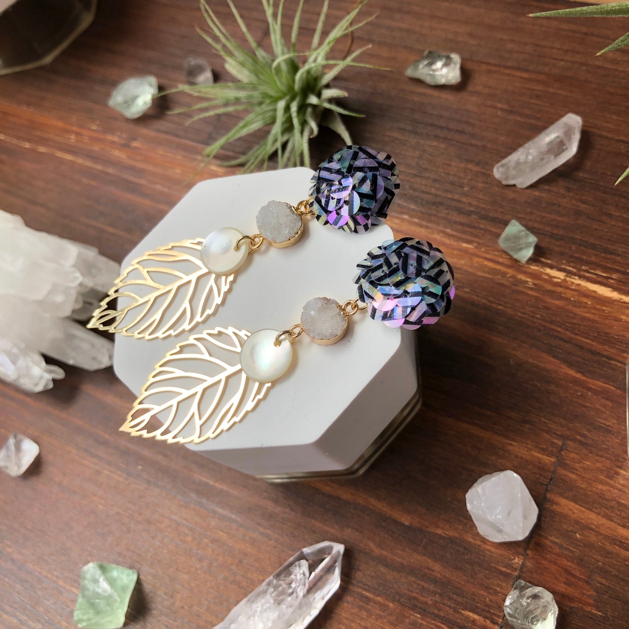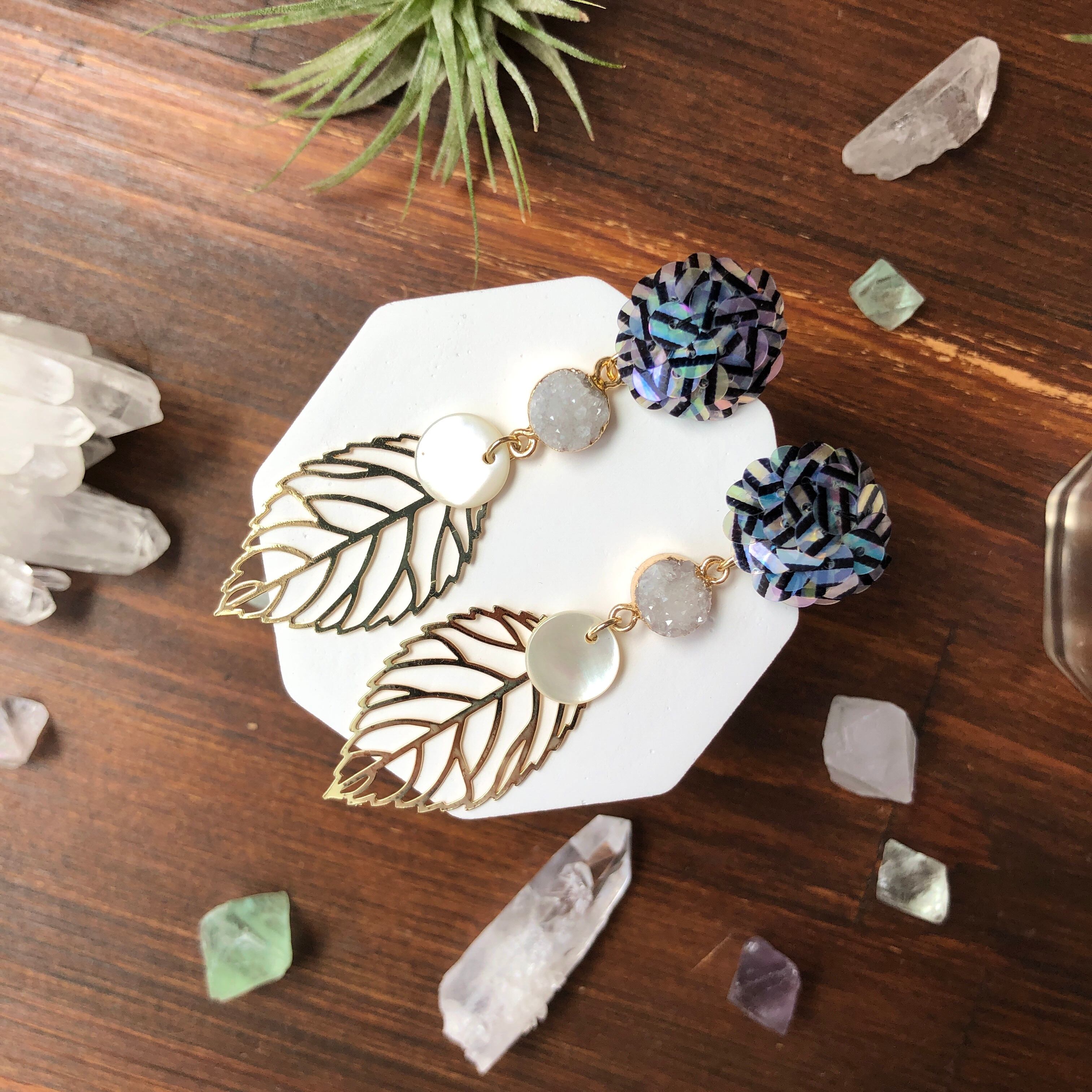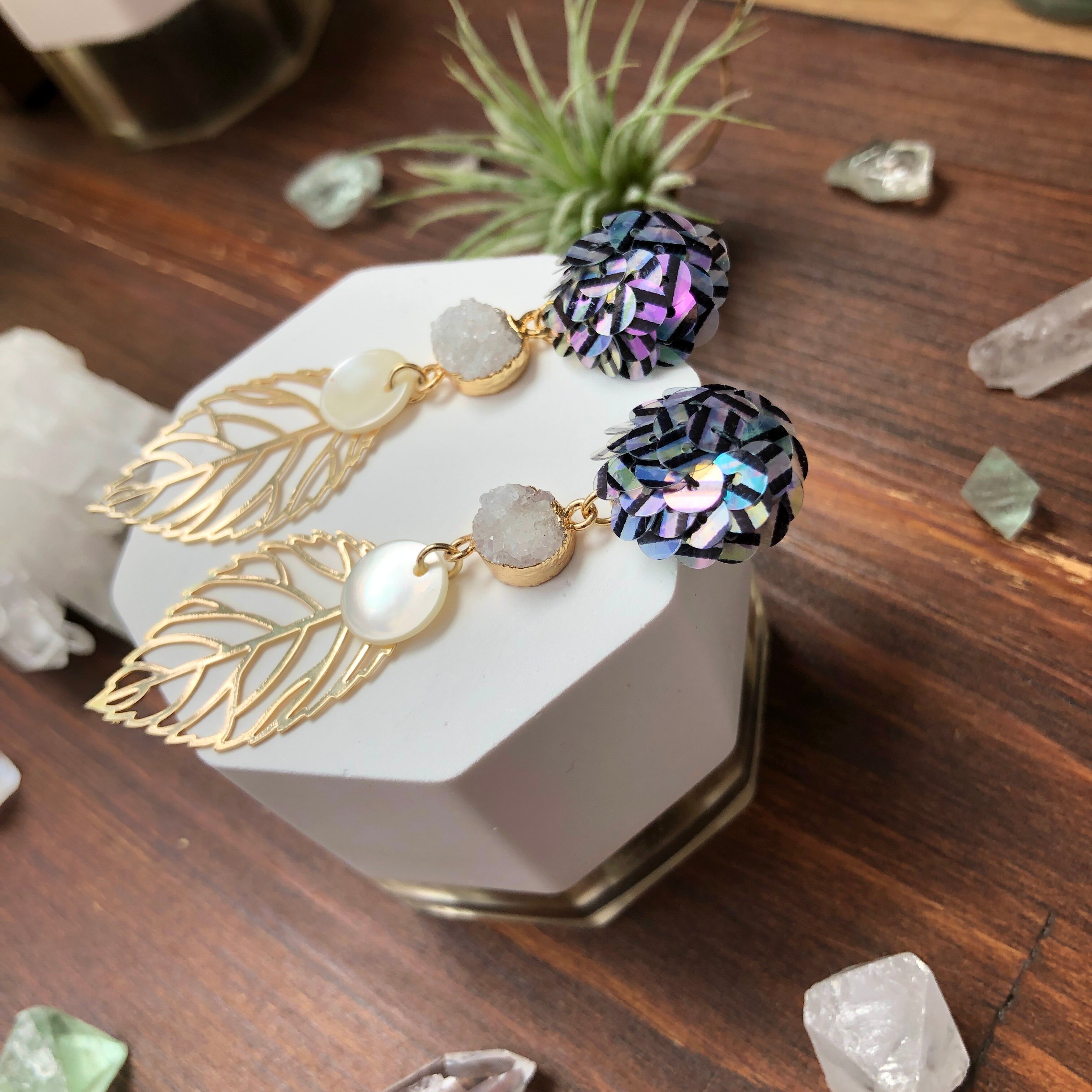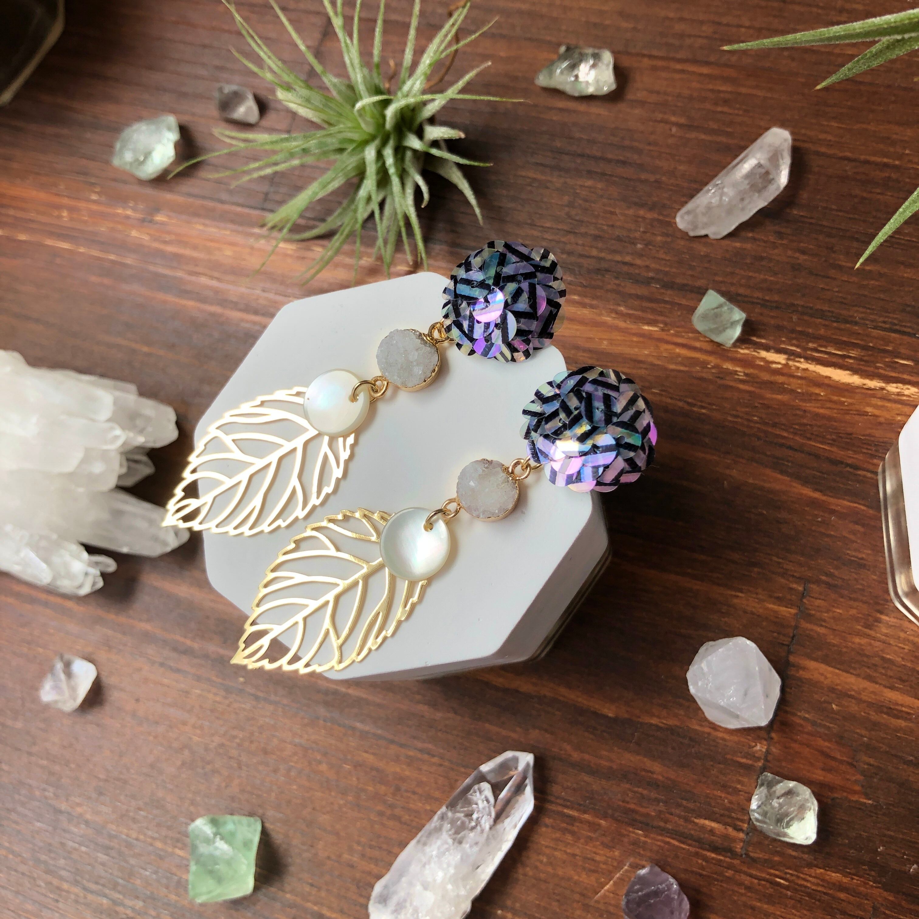 虹彩加工された、ストライプ柄入りのスパンコールを刺繍したピアス。